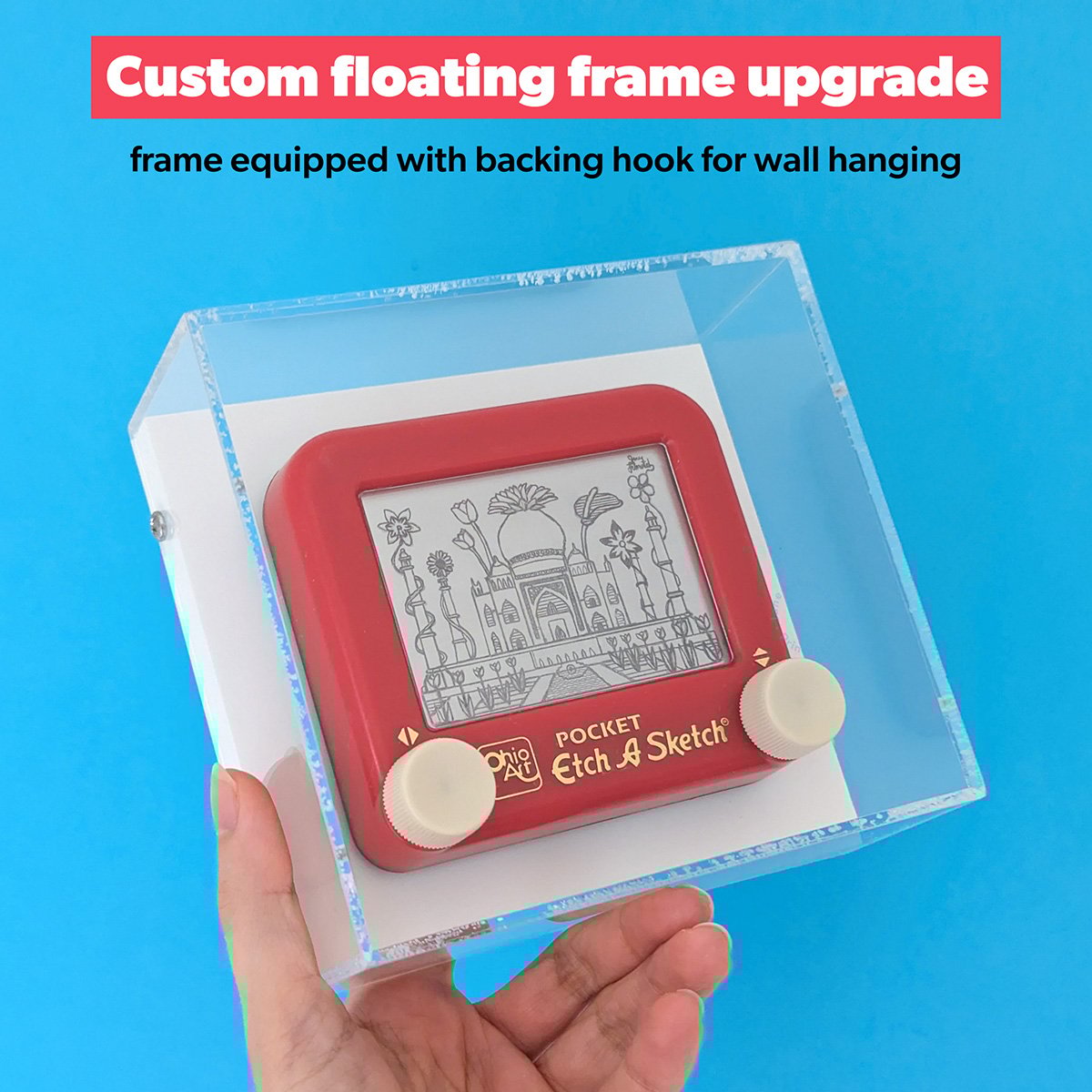 Custom floating frame equipped with sawtooth backing clip available for wall hanging!