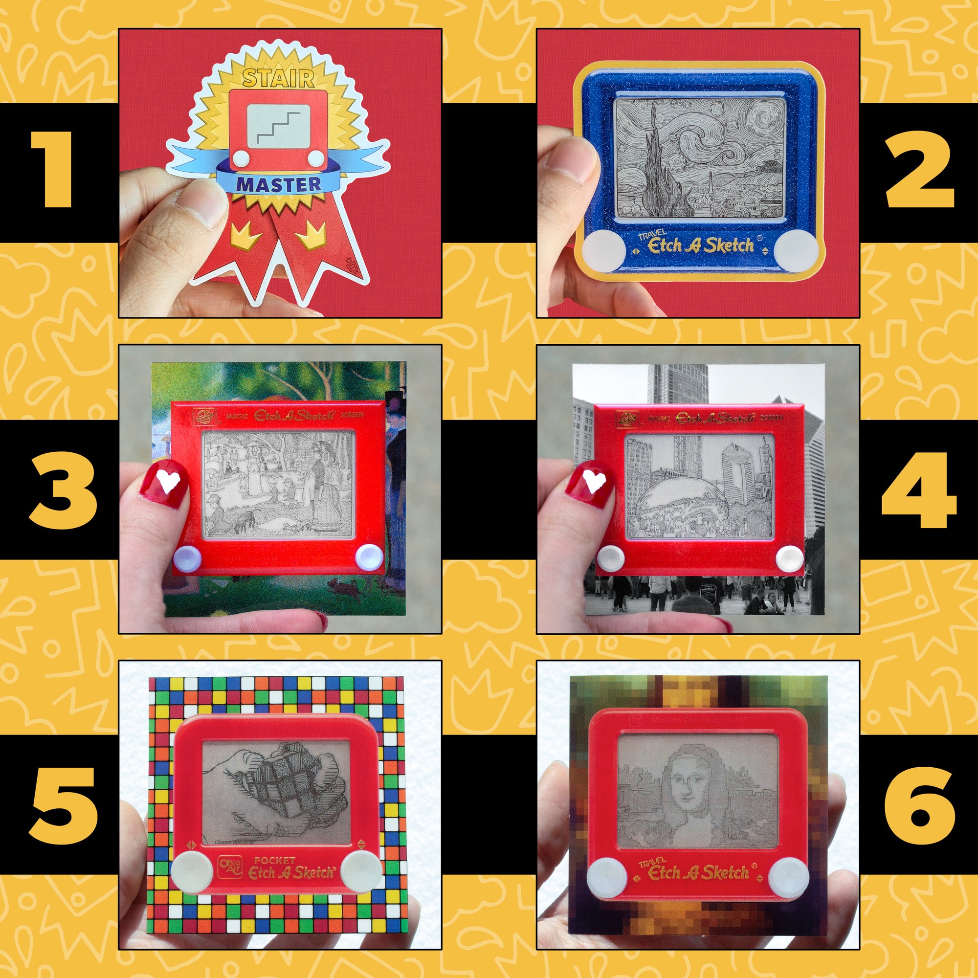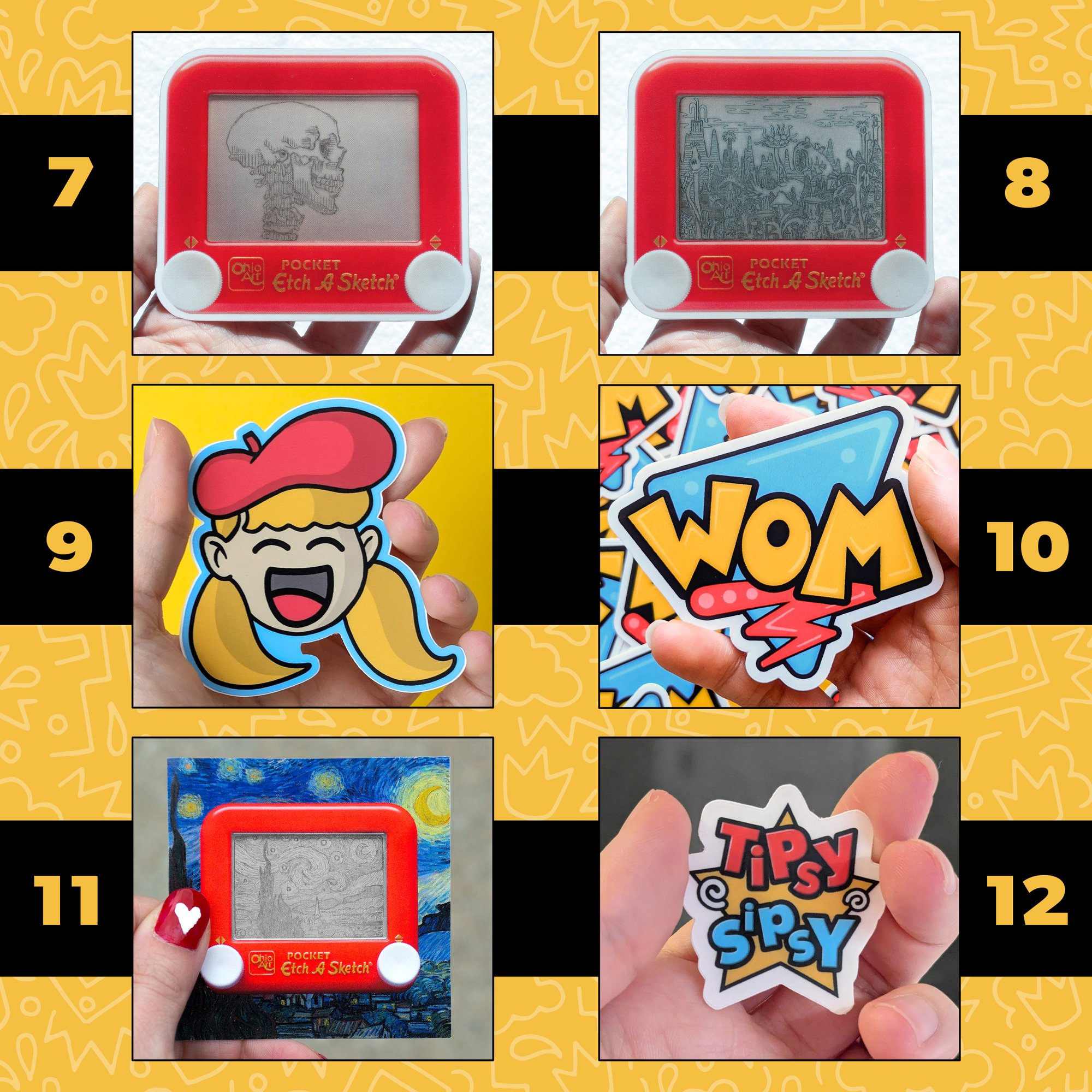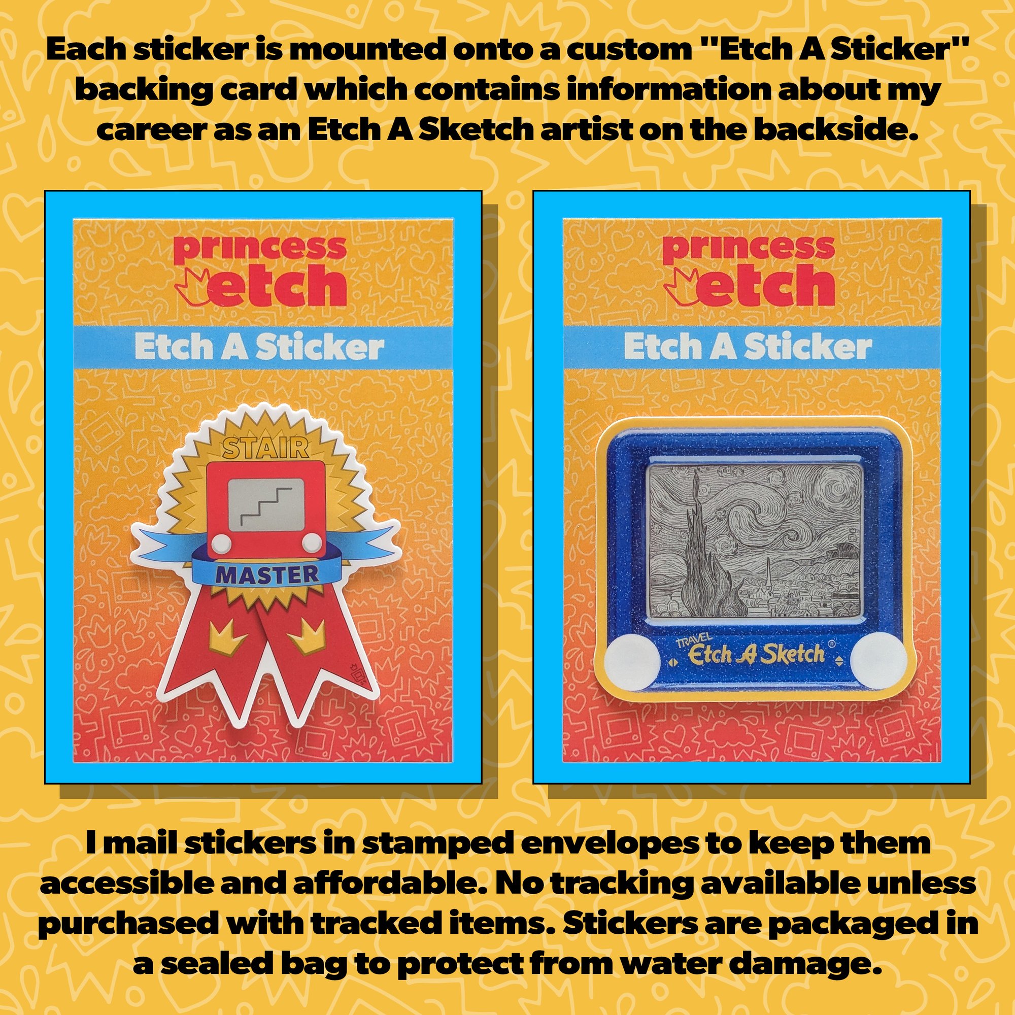Each sticker is mounted onto a custom "Etch A Sticker" backing card which contains information about my career as an Etch A Sketch artist on the backside.